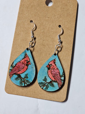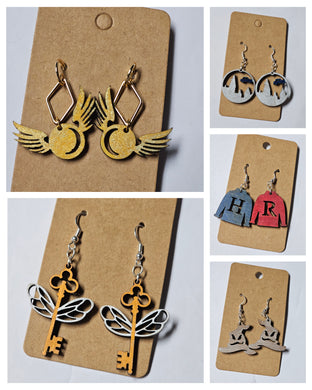 Materials vary - clay, hand painted wood, acrylic, resin, metal, beaded etc. With all earrings, please take special care and not wear while sleeping, swimming, showering or spraying materials on face and hair. All of our earrings have a protective sealant but are not fully water proof, the wood pieces especially should not be submerged under water.